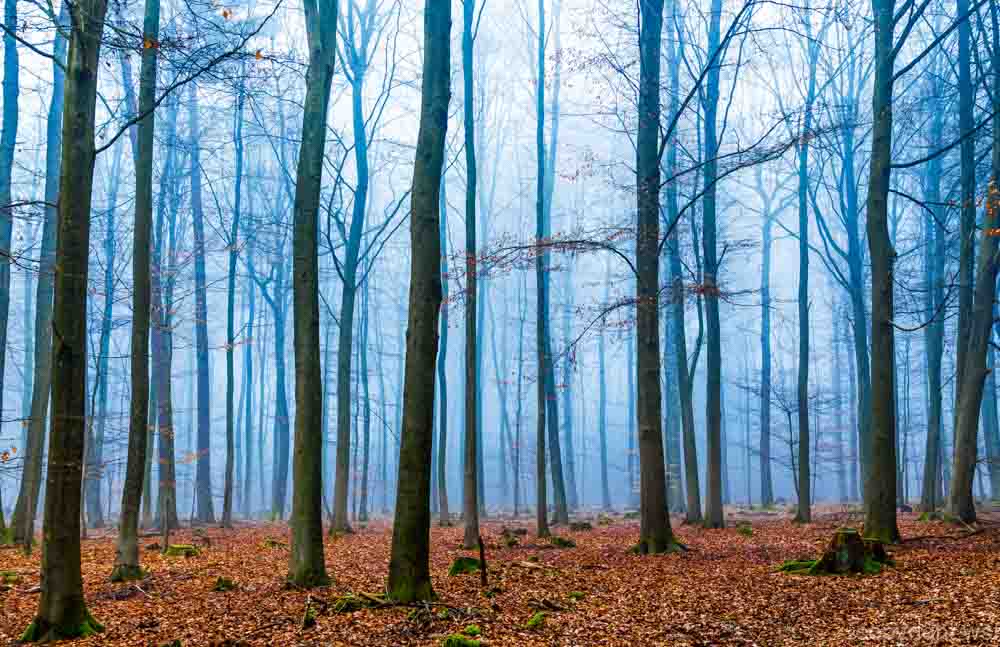 Magic forest in fog in blue and orange.