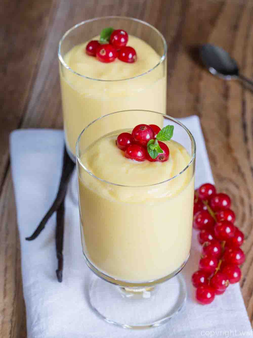 Vanillecreme Dessert mit Vanilleschote und Johannisbeere.