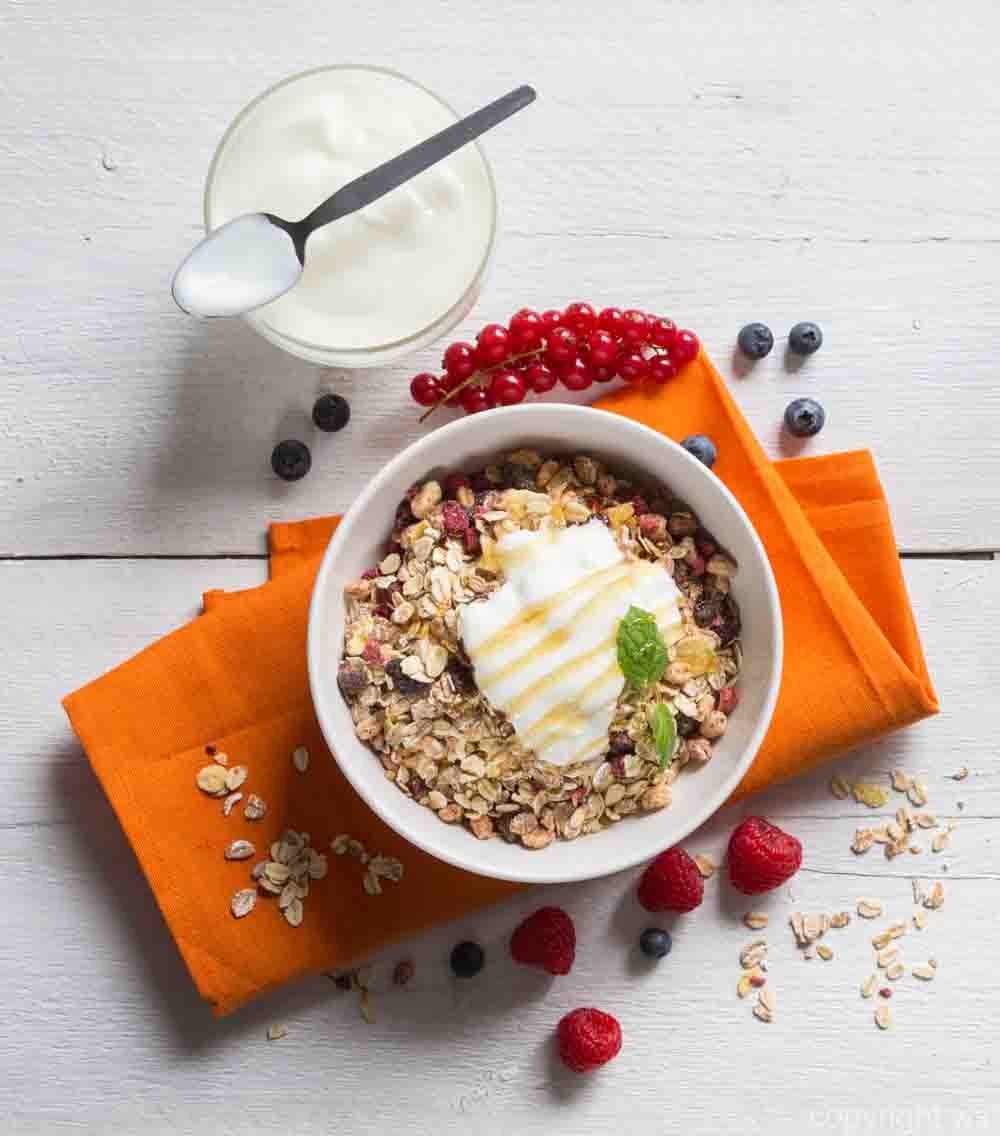 Cereal with yogurt and fruits on wood.