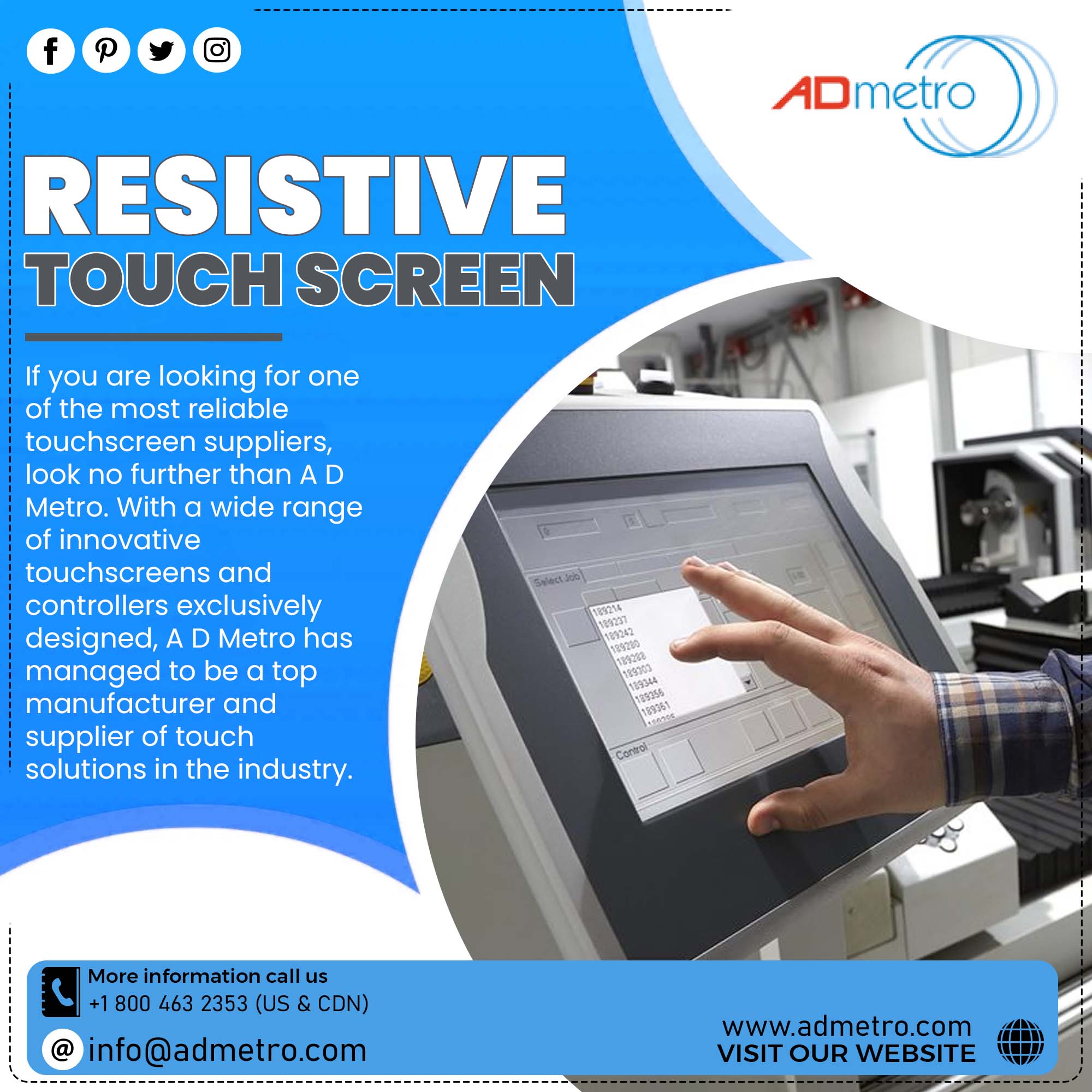 A D Metro is a leading supplier of touch screen solutions to original equipment manufacturers (OEMs), systems integrators and value added resellers. Our touch screen solutions are designed to address the requirements of commercial, industrial and military applications. Visit here: https://admetro.com/