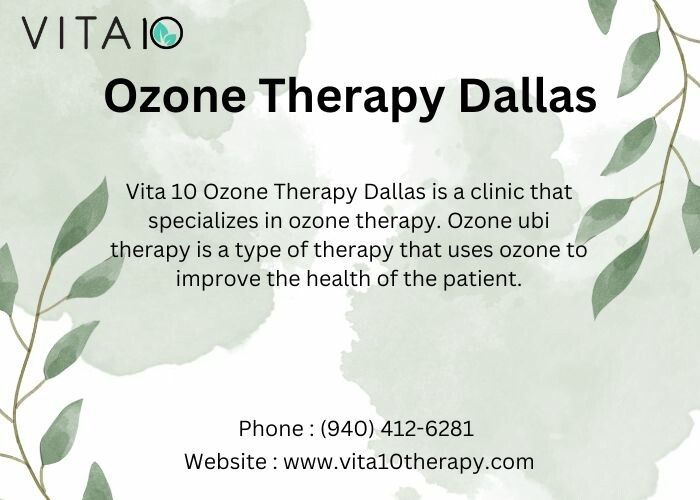Vita 10 Ozone Therapy Dallas is a clinic that specializes in ozone therapy. Ozone ubi therapy is a type of therapy that uses ozone to improve the health of the patient. This therapy is often used to treat conditions such as chronic fatigue, autoimmune diseases, and cancer. We use the latest technology to provide our clients with accurate and reliable results. To know more visit our website https://vita10therapy.com/ozone-and-ubi/ or call us at (940) 412-6281