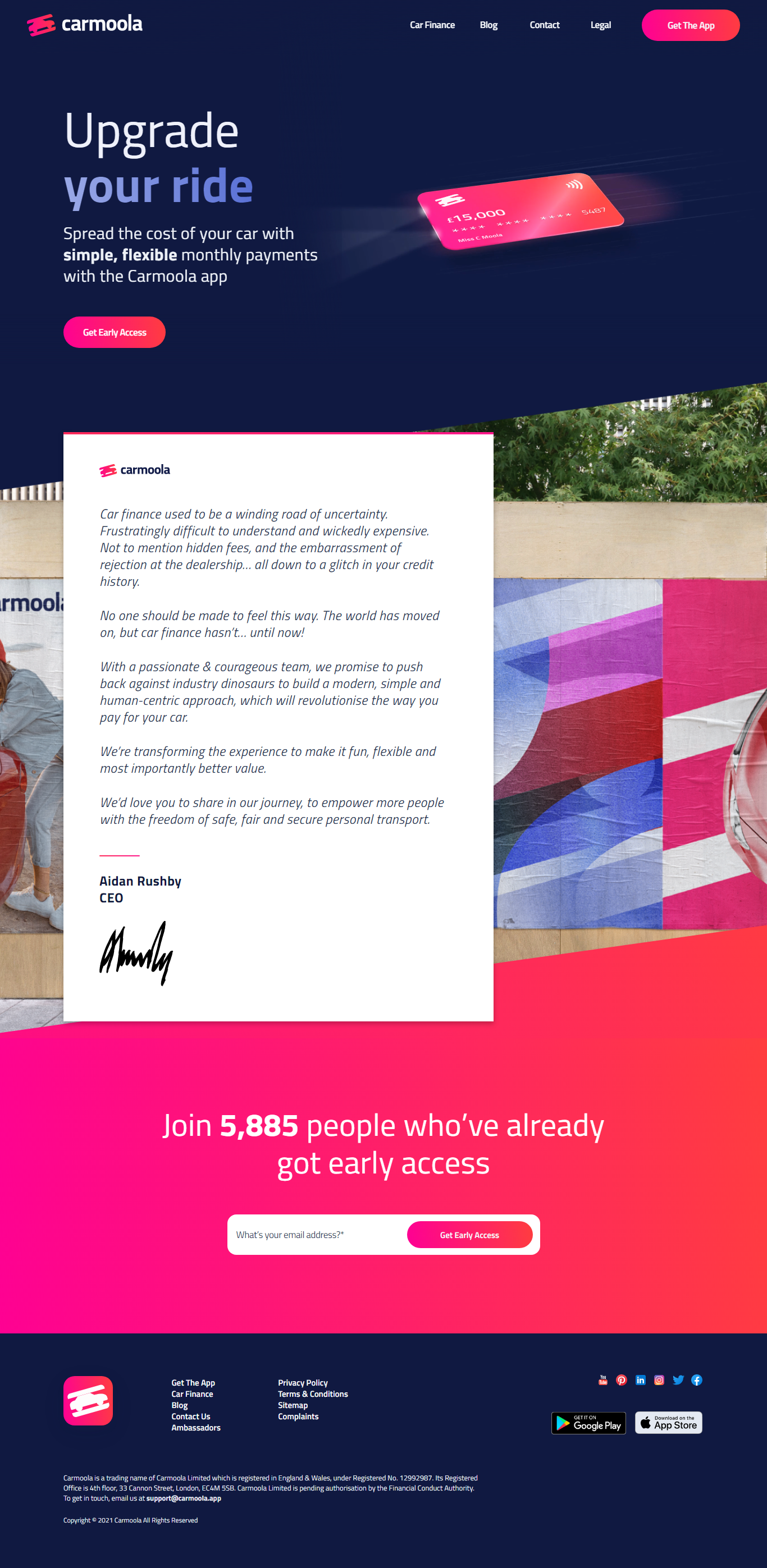 Car finance used to be a winding road of uncertainty. Frustratingly difficult to understand and wickedly expensive. Not to mention hidden fees, and the embarrassment of rejection at the dealership… all down to a glitch in your credit history. No one should be made to feel this way. The world has moved on, but car finance hasn’t… until now! With a passionate & courageous team, we promise to push back against industry dinosaurs to build a modern, simple and human-centric approach, which will revolutionise the way you pay for your car. We’re transforming the experience to make it fun, flexible and most importantly better value. We’d love you to share in our journey, to empower more people with the freedom of safe, fair and secure personal transport.