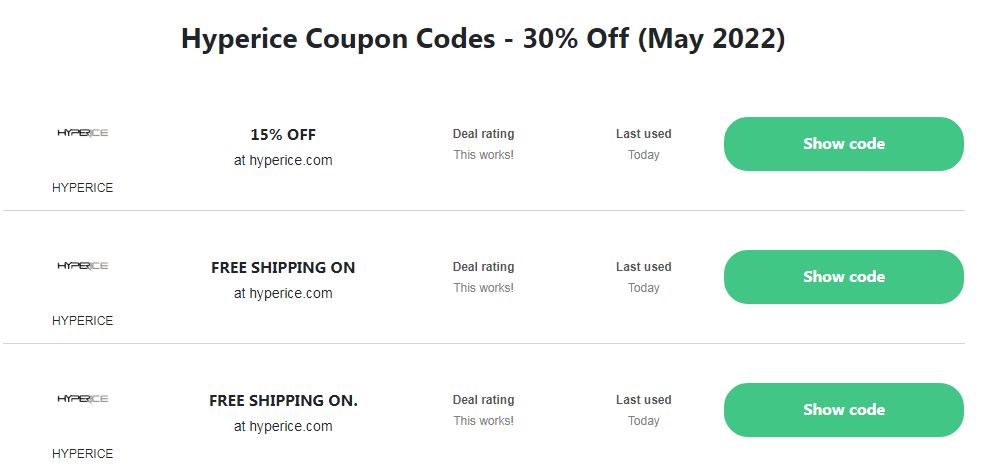 Dealrated currently has 25 active discount codes for HYPERICE. Our top deal will save you 30% off at HYPERICE. We've also discovered other coupons for 30% off.