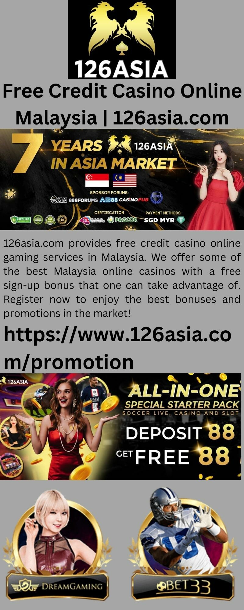 126asia.com provides free credit casino online gaming services in Malaysia. We offer some of the best Malaysia online casinos with a free sign-up bonus that one can take advantage of. Register now to enjoy the best bonuses and promotions in the market!