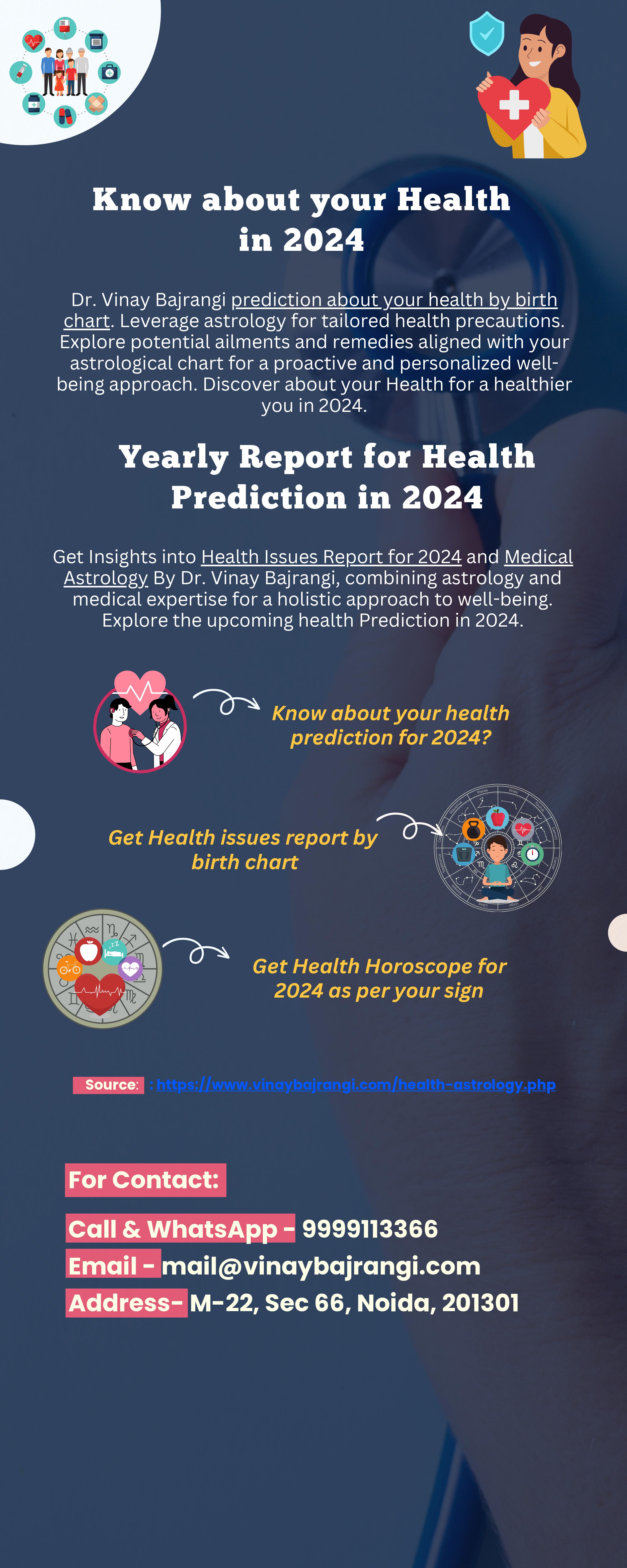 Get Insights into Health Issues Report for 2024 and Medical Astrology By Dr. Vinay Bajrangi, combining astrology and medical expertise for a holistic approach to well-being. Explore the upcoming health Prediction in 2024.
