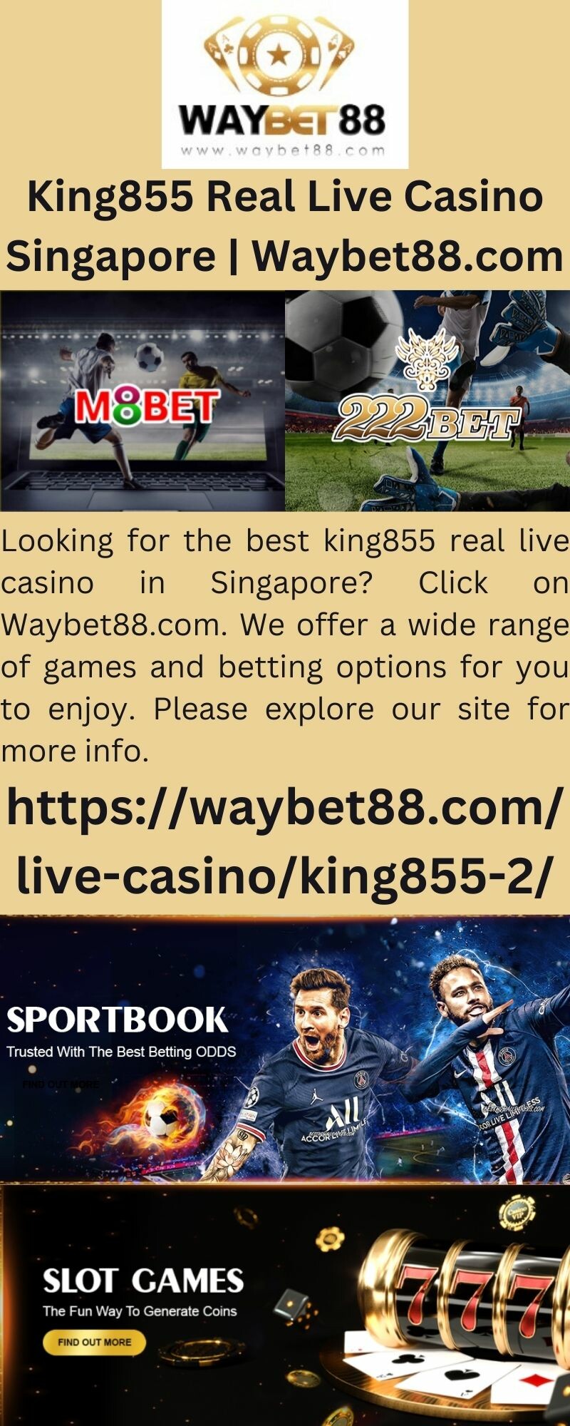 Looking for the best king855 real live casino in Singapore? Click on Waybet88.com. We offer a wide range of games and betting options for you to enjoy. Please explore our site for more info.