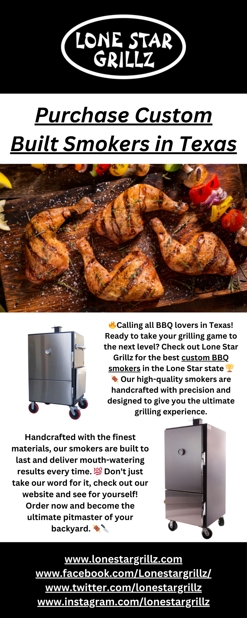 Calling all BBQ enthusiasts in the Lone Star state! Get ready to elevate your grilling game with our custom-built smokers from Lone Star Grillz. Made with top-quality materials and expert craftsmanship, these smokers are sure to bring out the best flavors in your BBQ. Grab yours now at https://lonestargrillz.com/collections/smokers and get ready to impress your friends and family at your next cookout.