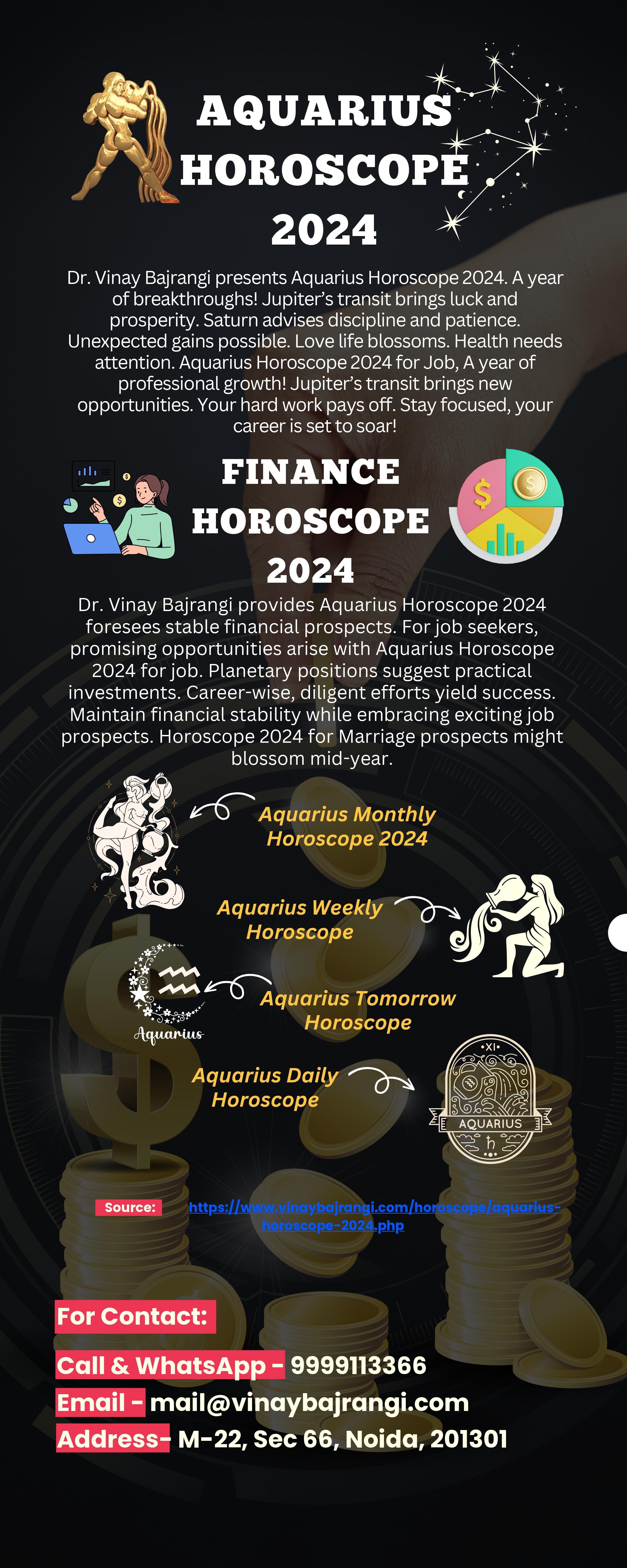 Dr. Vinay Bajrangi provides Aquarius Horoscope 2024 foresees stable financial prospects. For job seekers, promising opportunities arise with Aquarius Horoscope 2024 for job. Planetary positions suggest practical investments. Career-wise, diligent efforts yield success. Maintain financial stability while embracing exciting job prospects. Horoscope 2024 for Marriage prospects might blossom mid-year.