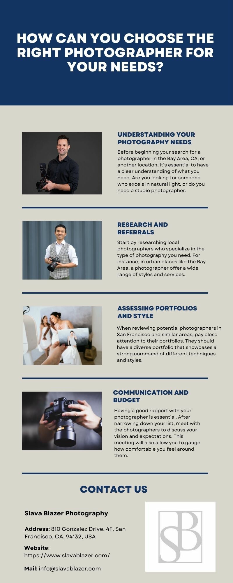 Selecting the right photographer in San Francisco and other places for your event or personal project is crucial. It's not just about capturing images but preserving memories and moments that are meaningful to you. Whether it’s a wedding, a family reunion, or corporate photography, choosing the right professional who gets your vision is significant. A photographer who understands your goals can capture the special moments of your event, turning them into lasting memories. When they connect with you and your guests, it makes the experience better, leading to more genuine and natural photos.