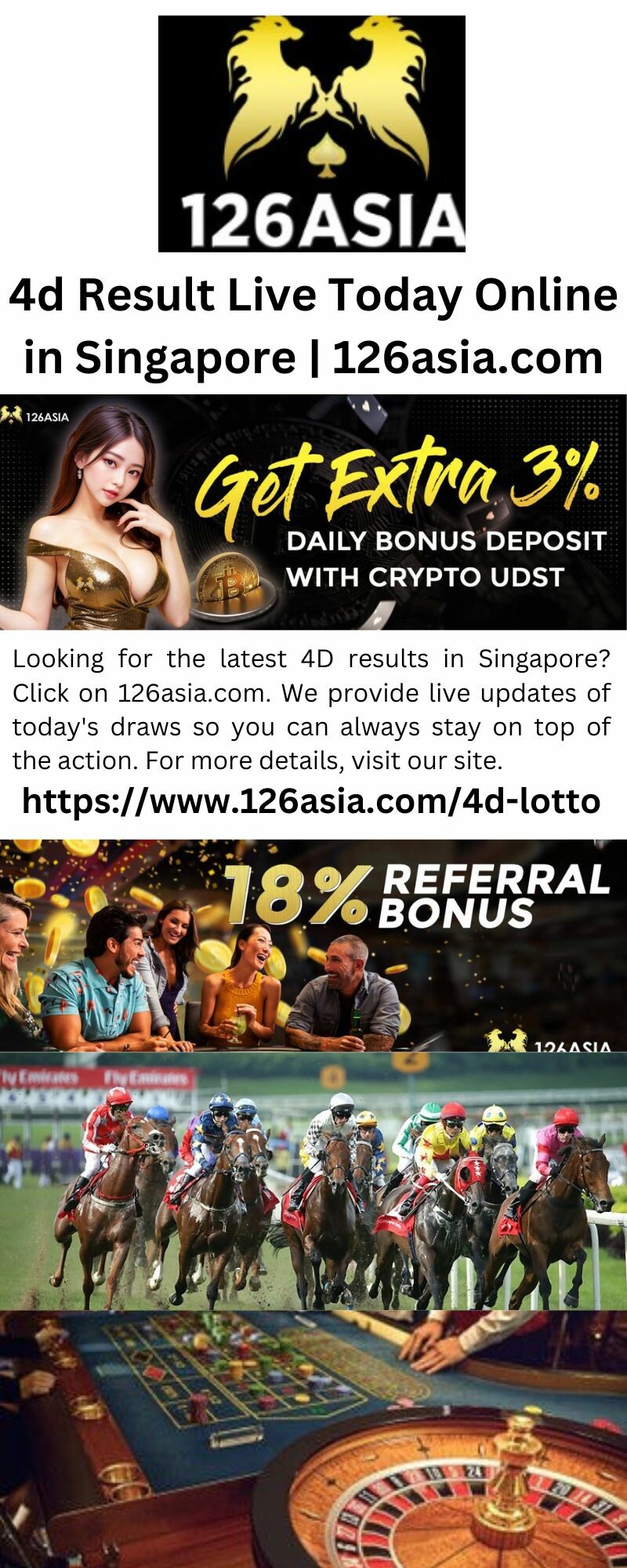 Looking for the latest 4D results in Singapore? Click on 126asia.com. We provide live updates of today's draws so you can always stay on top of the action. For more details, visit our site.