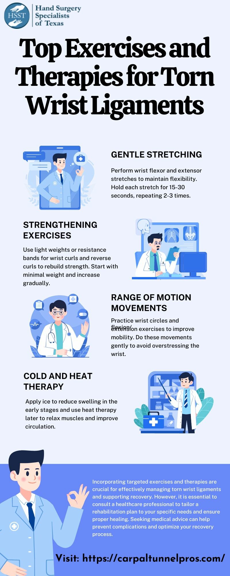 Explore the guide top exercises and therapies for torn wrist ligaments tailored for patients of Hand Surgery Specialists of Texas. Our expert team recommends initial rest and ice, followed by a range of motion exercises to enhance flexibility. Strengthening workouts using resistance bands can help rebuild muscle support, while personalized physical therapy ensures optimal recovery. Additionally, ultrasound therapy can alleviate pain and inflammation. Trust our specialists for a comprehensive approach to wrist rehabilitation and regain your strength safely. Visit our website : https://carpaltunnelpros.com
