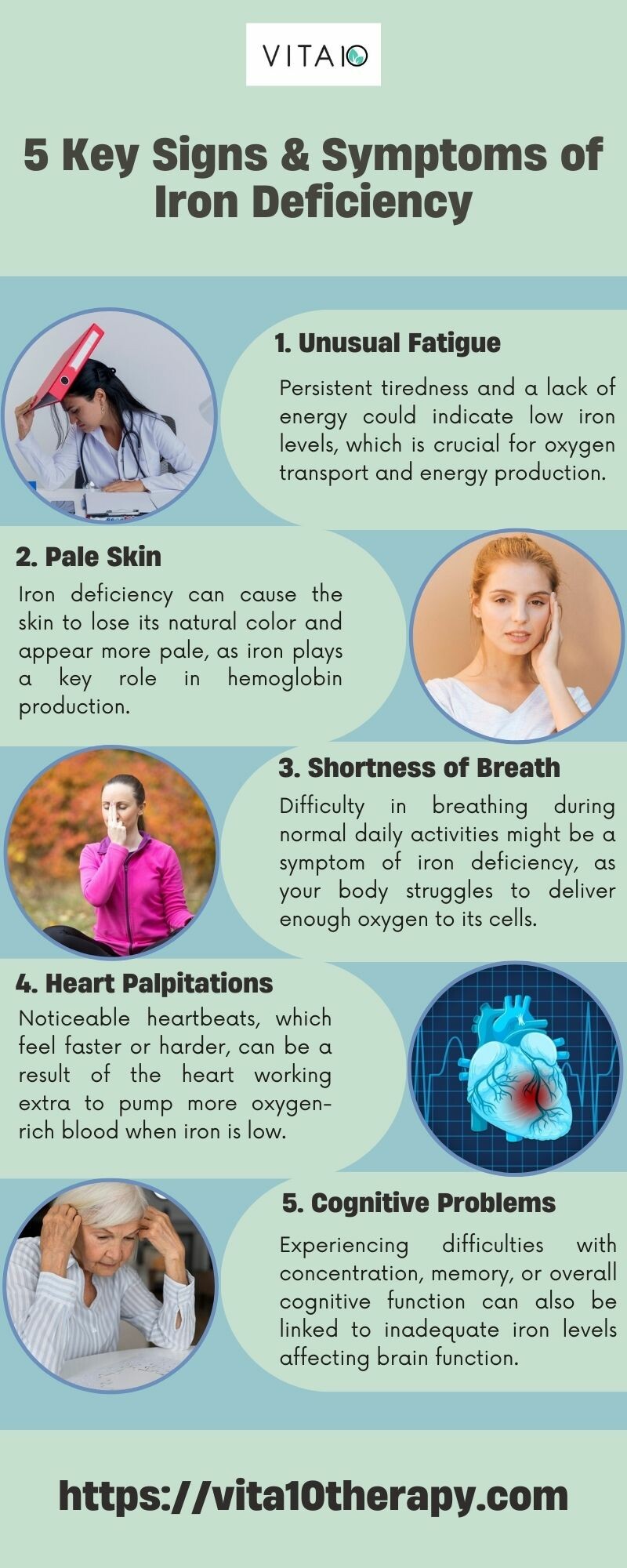 Feeling tired and pale? It could be iron deficiency! Learn about the common signs and symptoms of iron deficiency and how to get back on track to feeling your best. This informative guide explores fatigue, shortness of breath, and other symptoms to watch for. For more details, visit our website: https://vita10therapy.com/