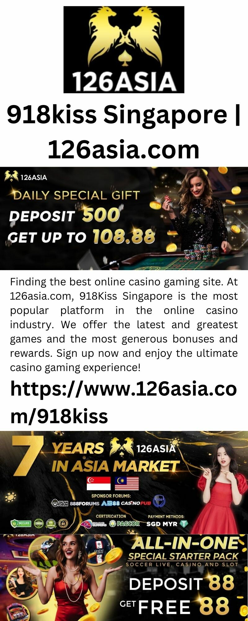 Finding the best online casino gaming site. At 126asia.com, 918Kiss Singapore is the most popular platform in the online casino industry. We offer the latest and greatest games and the most generous bonuses and rewards. Sign up now and enjoy the ultimate casino gaming experience!.