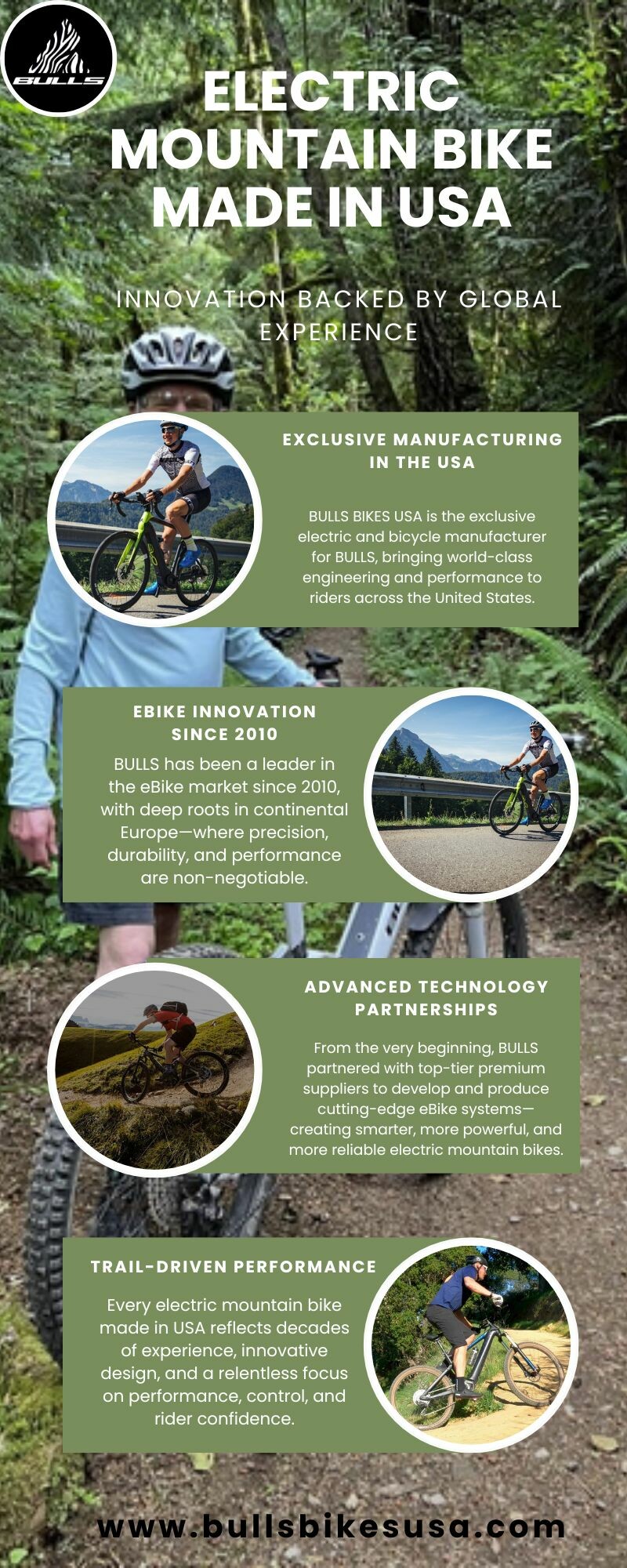 BULLS BIKES USA as an exclusive bicycle and eBIKE manufacturer. BULLS has been in the eBike market since 2010, mainly in continental Europe. Since the early stages, partnering in the development and production of eBike systems with top premium suppliers, gave BULLS a key advantage in developing the most innovative systems, far ahead of the competition. Website: https://bullsbikesusa.com/