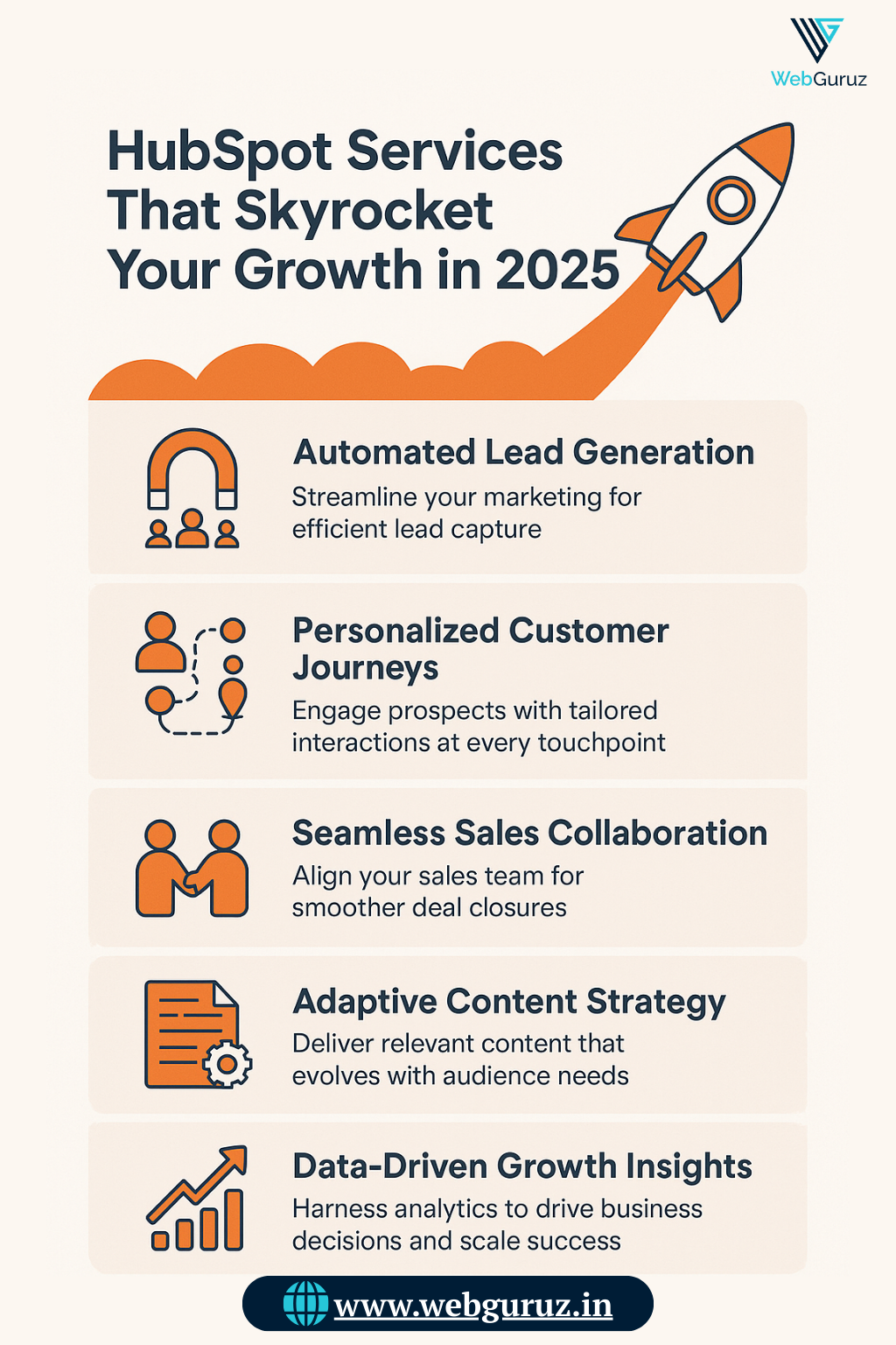 HubSpot experts at WebGuruz make business growth effortless by setting up and customizing HubSpot for marketing, sales, service, and operations. From onboarding and website development to automation, migration, and data syncing, we ensure smooth processes, improved customer experiences, and higher efficiency — giving your business the competitive edge it needs in 2025.