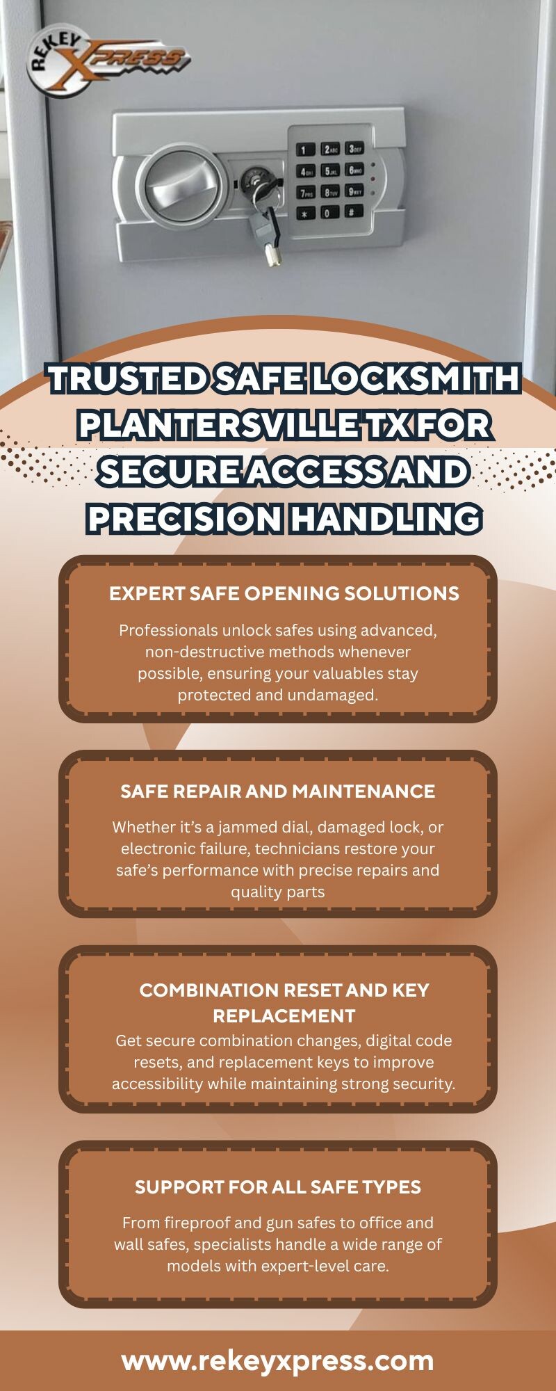Choosing a reliable safe locksmith in Plantersville TX ensures your valuables remain accessible and secure. Skilled technicians specialize in safe opening, combination changes, repairs, and digital lock resets using professional tools designed for precision. Whether your safe is stuck, malfunctioning, or needs a code update, on-site experts provide fast, damage-free solutions tailored to both home and business safes—restoring safety, functionality, and peace of mind. Visit us at:https://rekeyxpress.com/plantersville-locksmith-services/