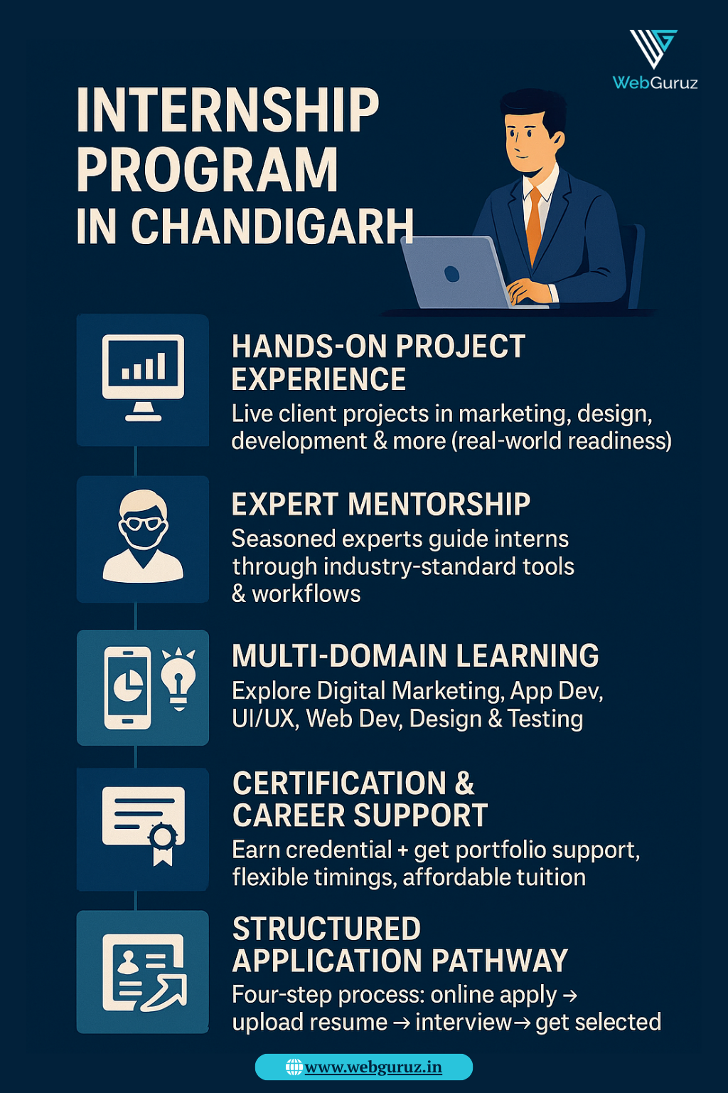 Start your career journey with WebGuruz’s internship program in Chandigarh and Mohali. Get hands-on exposure by working on real projects under expert guidance while developing job-ready skills. Designed for students and beginners, this program covers digital marketing, web development, and more. Enhance your resume, build confidence, and open doors to rewarding career opportunities with practical training that truly matters.