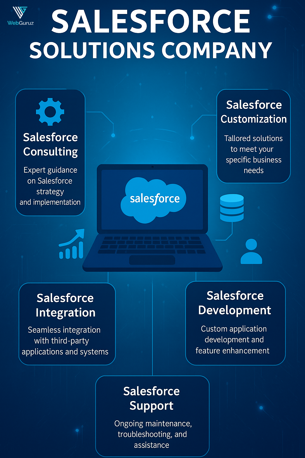 WebGuruz specializes in customized Salesforce solutions powered by AI—covering CPQ automation, Service Cloud efficiency, Sales Cloud enhancements, Einstein analytics, and Marketing Cloud strategies. With 50+ certified experts and 12+ years of proven experience, we provide round-the-clock support, clear pricing, and end-to-end services that turn your Salesforce CRM into a powerful engine for business success.