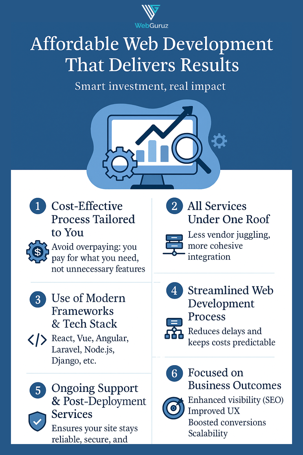 Get a powerful, affordable website that truly performs. At WebGuruz Technologies, we specialize in delivering expert web development services using modern frameworks like React, Laravel, and Node.js. From design to deployment, our responsive and secure websites enhance user experience, boost online visibility, and help businesses attract customers, increase conversions, and grow with confidence.