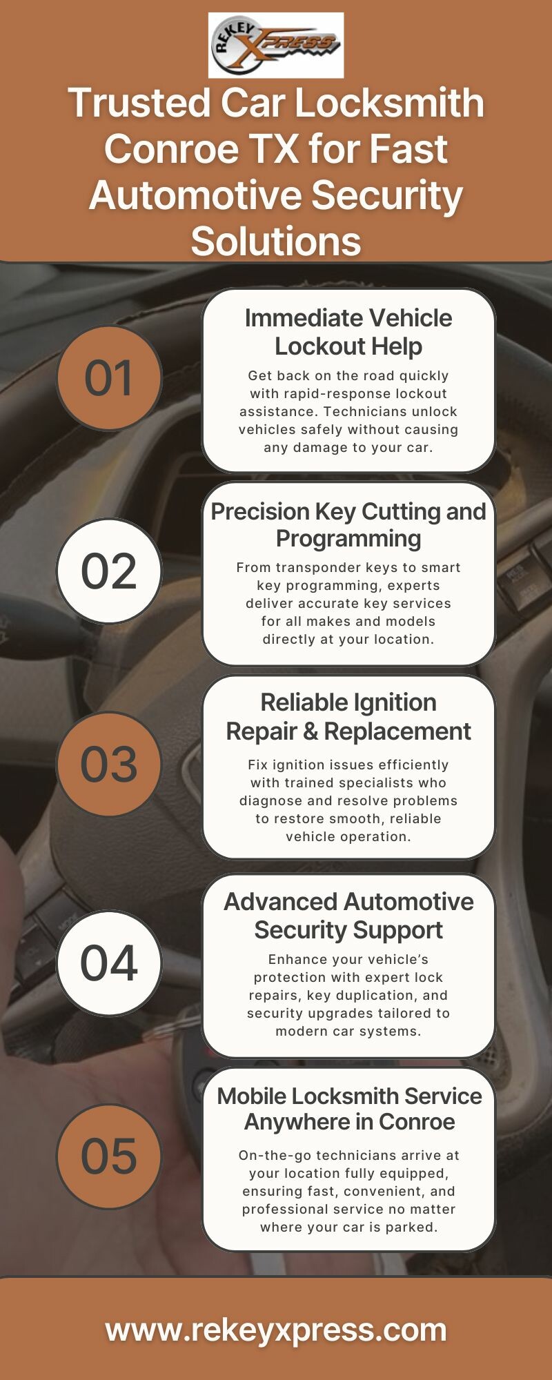 When you need a dependable car locksmith in Conroe TX, professional technicians provide fast, affordable, and expert automotive locksmith services. Whether you're locked out, dealing with a faulty ignition, or need a new programmed key, on-site specialists deliver quick solutions using advanced tools. With accurate diagnostics, mobile convenience, and secure service, your vehicle stays protected and fully functional wherever you are in Conroe. Visit us at:https://rekeyxpress.com/conroe-locksmith-services/