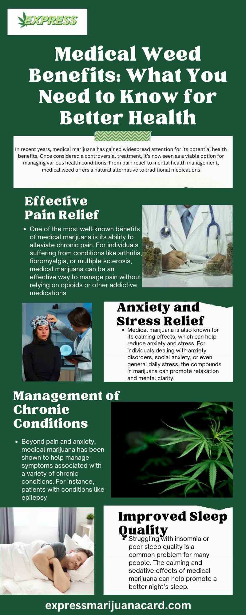 Medical cannabis, commonly referred to as medical marijuana, is derived from the Cannabis sativa plant and has gained recognition for its therapeutic benefits. It contains active compounds like THC (tetrahydrocannabinol) and CBD (cannabidiol), which interact with the body's endocannabinoid system to regulate various physiological processes. For more info visit :https://expressmarijuanacard.com/